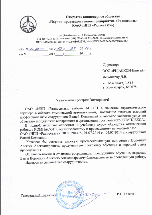 Temmuz ayında, Krasnoyarsk Bilim ve Üretim Şirketi “Radiocommunication” da, tasarımcıların “KOMPAS-3D’de Optimizasyon Araçları” kursuna katılımı sağlandı. NPP Radyo İletişiminin entegre otomasyon alanındaki stratejik ortağı ASCON-Yenisei bölgesel merkezi eğitimi düzenledi.